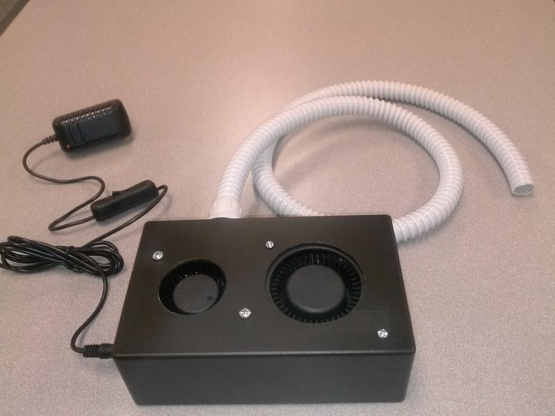 This unit incorporates powerful twin 34 CFM blowers. One blows cold air through a 1/2" fitting and hose to cool the tower (same setup as our Super Tower Cooler) and another blows cold air directly out of the box to circulate air inside of the kegerator. This provides a more uniform temperature throughout the kegerator and prevents icing on the cooling plate and the problem of freezing beer when the keg gets low. The 34 CFM blower is MUCH MORE powerful than the tiny fan most kegerators have for air circulation, and will make a HUGE difference.