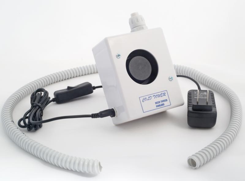 Our Standard Beer Tower Cooler is equipped with a 34 CFM BLOWER, 12 volt power supply with on/off switch, and 3/8" air hose and fitting. It provides very good cooling and much less foam on your beer.